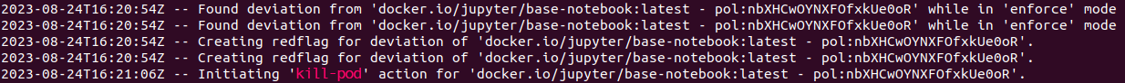 Foiled again by Spyderbat! The Guardian policy invoked an automated action to kill the pod, subsequently killing the Red Team's backdoor. Kubernetes will re-create the pod and container back in a clean state, giving the Spyderbat Blue Team time to resolve the vulnerability or keep the container off-line until it can be resolved.
