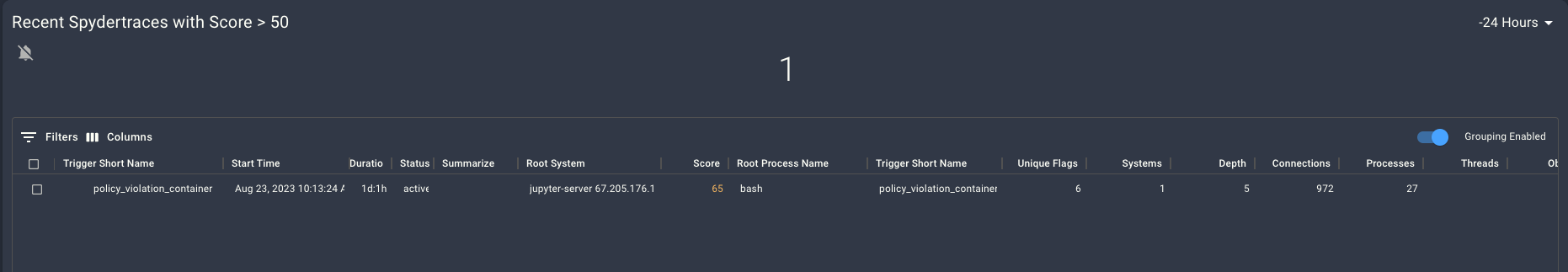 Within a couple minutes of the attack, the Spyderbat Blue Team saw a high-scoring trace appear on their dashboard.